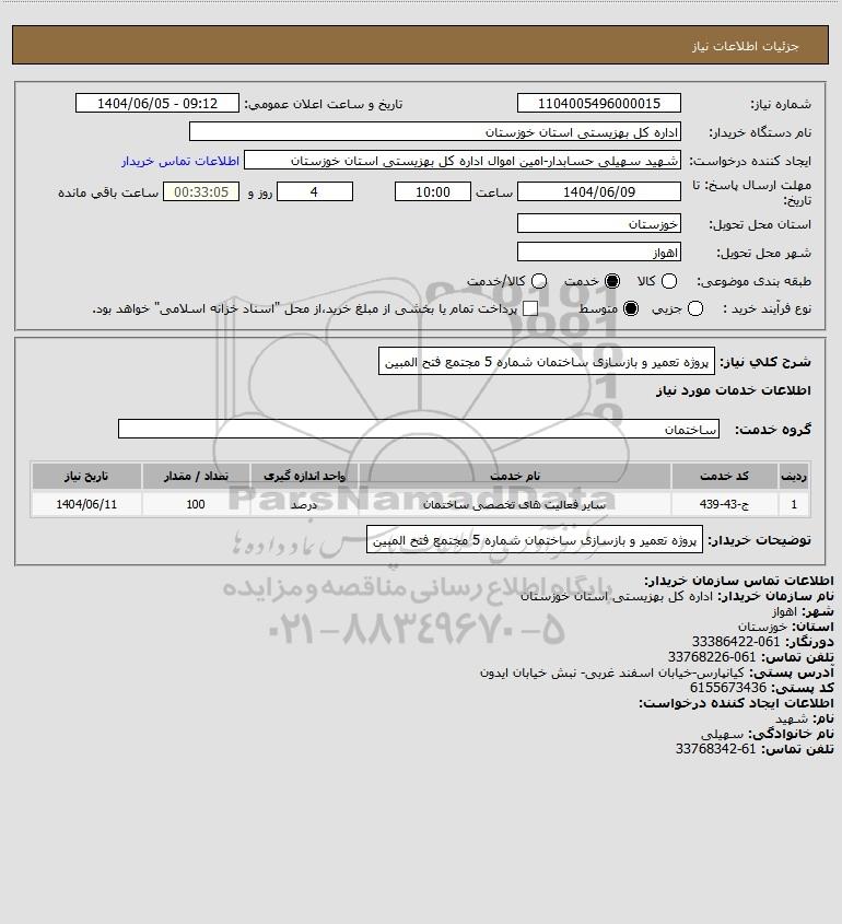 شرح کلی نیاز: پروژه تعمیر و بازسازی ساختمان شماره 5 مجتمع فتح المبین