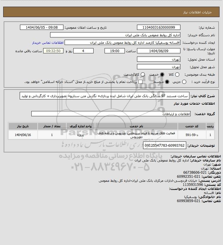 شرح کلی نیاز: ساخت مستند 97 سالگی بانک ملی ایران شامل ایده پردازی+ نگارش متن سناریو+ تصویربرداری + کارگردانی و تولید