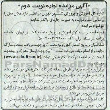 اداره کل آموزش و پرورش شهر تهران در نظر دارد مکان ذیل را بر اساس اسناد مزایده به صورت اجاره ای واگذار نماید.