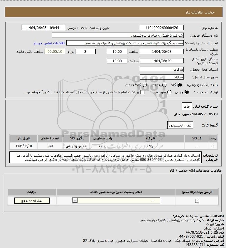 استعلام بها و موضوع استعلام استعلام چای به اطلاع کلیه شرکتها و افراد متخصص واجد شرایط میرساند، آگهی گذار در نظر دارد از طریق استعلام بها، نسبت به انتخاب و دریافت پیشنهادات اقدام نماید. این استعلام با کد آگهی ثبت شده در سامانه خبرگزاری پارس نماد : 9462867 منتشر شده است. مشخصات استعلام : تاریخ شروع استعلام: 1404/06/05 آخرین مهلت ارسال پیشنهاد قیمت : 1404/06/08 و محل اجرای پروژه : استان مرکزی میباشد. استعلام قیمت مورد درخواست : استعلام چای با دستهبندیهای تخصصی و گروه های مرتبط : مواد غذایی, چای, استعلام اطلاع رسانی میگردد.