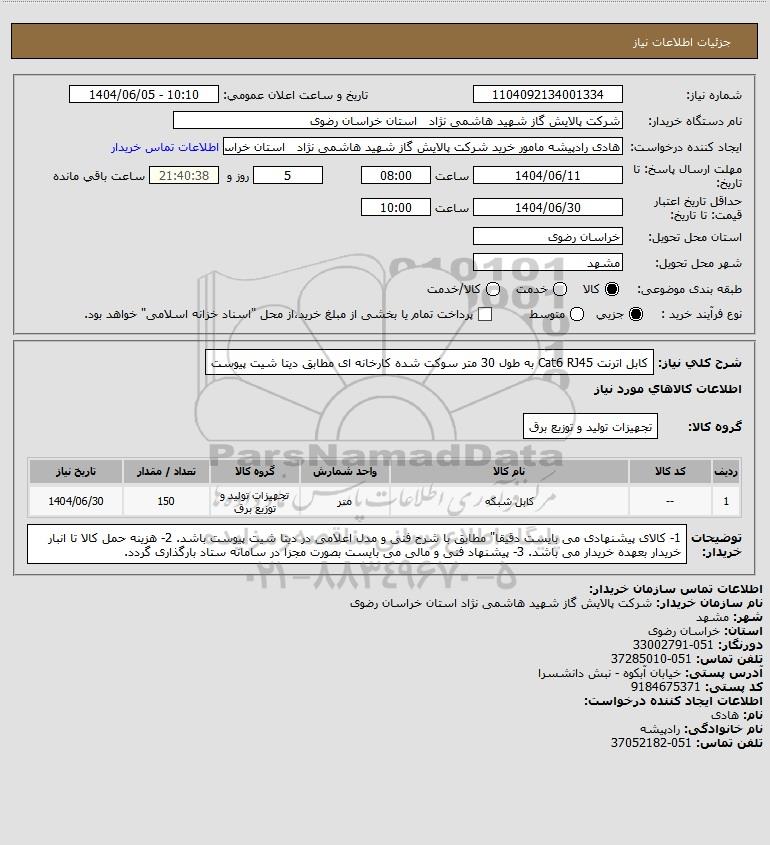 نام دستگاه خریدار:شرکت پالایش گاز شهید هاشمی نژاد استان خراسان رضوی