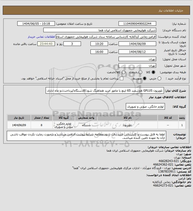 شرح کلی نیاز: تلویزیون GPLUS هوشمند 65 اینچ با مامور خرید هماهنگ شود/8دستگاه/پرداخت:دو ماه اداری
