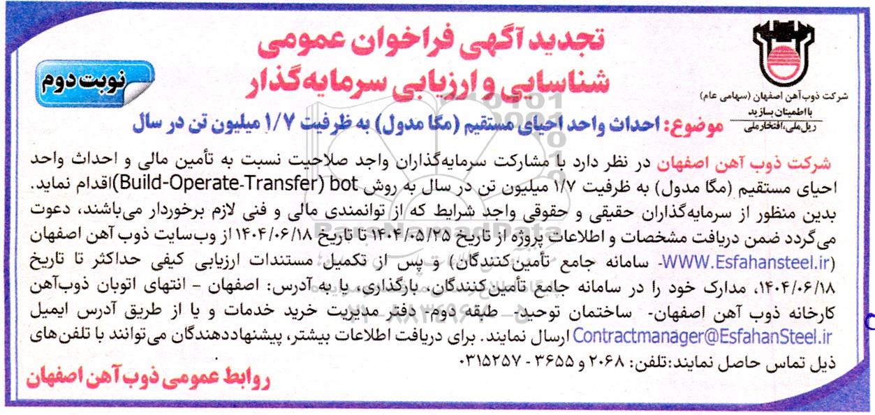 بدین منظور از سرمایه گذاران حقیقی و حقوقی واجد شرایط که از توانمندی مالی و فنی لازم برخوردار میباشند دعوت می گردد ضمن دریافت مشخصات و اطلاعات پروژه از تاریخ 1404.5.25 تا تاریخ 1404.6.18 از وب سایت ذوب آهن اصفهان (www.Esfahansteel.ir سامانه جامع تأمین کنندگان) و پس از تکمیل مستندات ارزیابی کیفی حداکثر تا تاریخ 1404.6.18،  مدارک خود را در سامانه جامع تأمین کنندگان، بارگذاری یا به آدرس اصفهان - انتهای اتوبان ذوب آهن - کارخانه ذوب آهن اصفهان - ساختمان توحید - طبقه دوم - دفتر مدیریت خرید خدمات و یا از طریق آدرس ایمیل Contractmanager@EsfahanSteel.ir  ارسال نمایند . برای دریافت اطلاعات بیشتر پیشنهاد دهندگان میتوانند با تلفن های ذیل تماس حاصل نمایند.