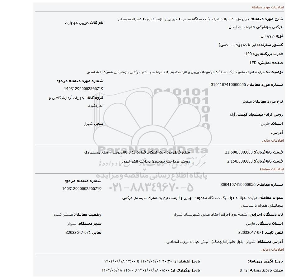 شرح مورد معامله: حراج مزایده اموال منقول -یک دستگاه مجموعه دوربین و لنزمستقیم به همراه سیستم حرکتی پنوماتیکی همراه با شاسی | نام کالا: دوربین تئودولیت | |