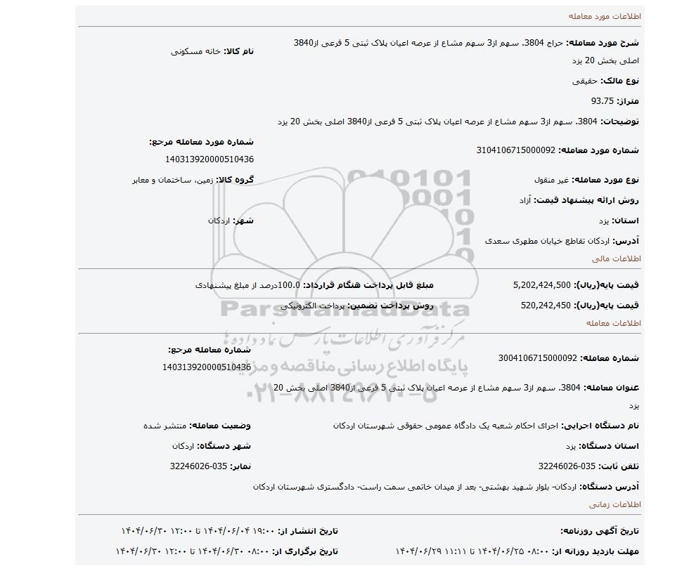 | شرح مورد معامله: حراج 3804. سهم از3 سهم مشاع از عرصه اعیان پلاک ثبتی 5 فرعی از3840 اصلی بخش 20 یزد | نام کالا: خانه مسکونی | |