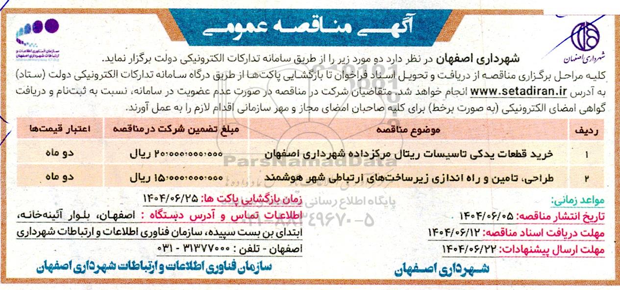شهرداری اصفهان در نظر دارد دو مورد زیر را از طریق سامانه تدارکات الکترونیکی دولت برگزار نماید .