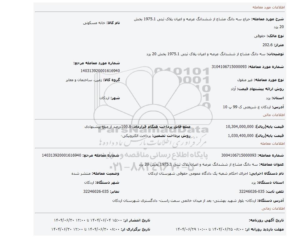 مزایده، سه دانگ مشاع از ششدانگ عرصه و اعیان پلاک ثبتی 1975.1 بخش 20 یزد