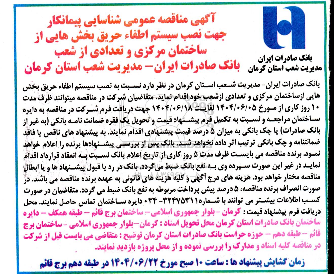 آگهی مناقصه عمومی شناسایی پیمانکار جهت نصب سیستم اطفاء حریق بخش هایی از ساختمان مرکزی و تعدادی از شعب بانک صادرات ایران مدیریت شعب استان کرمان