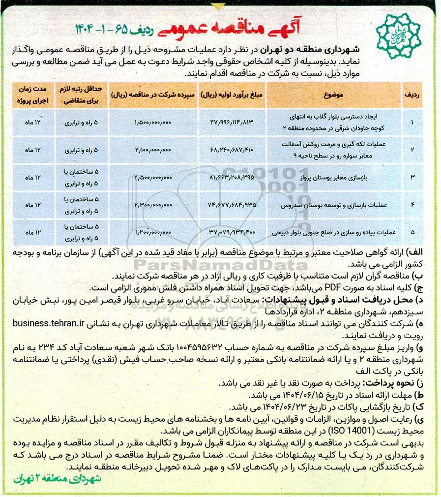 شهرداری منطقه دو تهران در نظر دارد عملیات مشروحه ذیل را از طریق مناقصه عمومی واگذار نماید. بدینوسیله از کلیه اشخاص حقوقی واجد شرایط دعوت به عمل می آید ضمن مطالعه و بررسی موارد ذیل نسبت به شرکت در مناقصه اقدام نمایند.