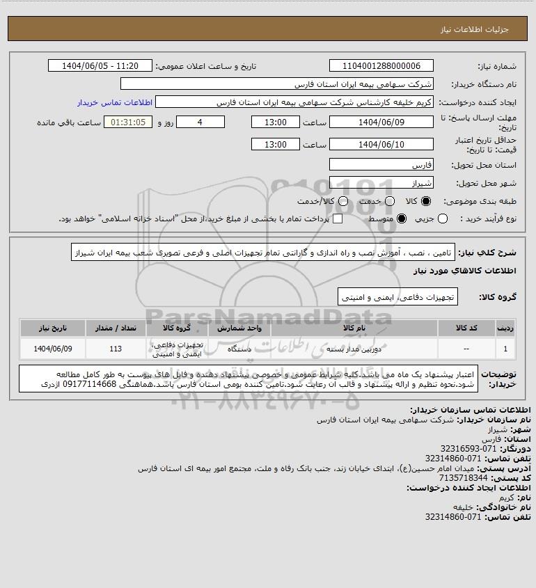 شرح کلی نیاز: تامین ، نصب ، آموزش نصب و راه اندازی و گارانتی تمام تجهیزات اصلی و فرعی تصویری شعب بیمه ایران شیراز