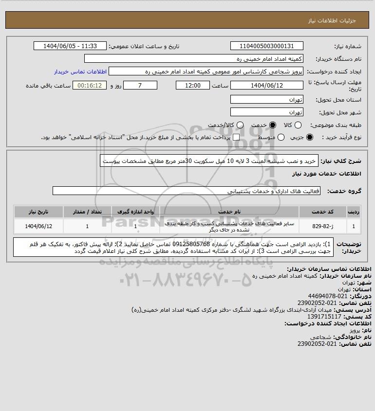 شرح کلی نیاز: خرید و نصب شیشه لمینت 3 لایه 10 میل سکوریت 30متر مربع مطابق مشخصات پیوست