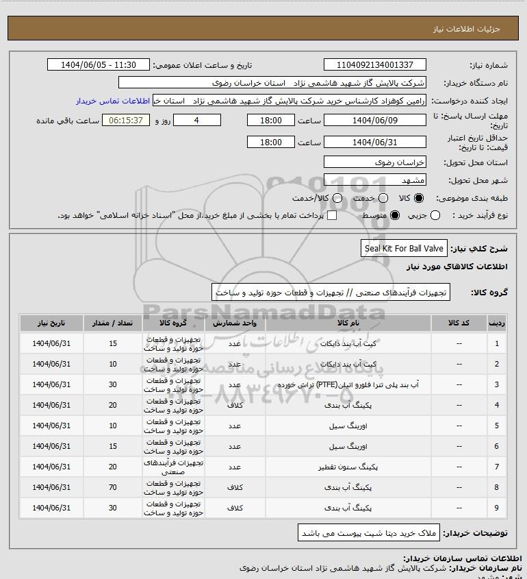 نام دستگاه خریدار:شرکت پالایش گاز شهید هاشمی نژاد استان خراسان رضوی