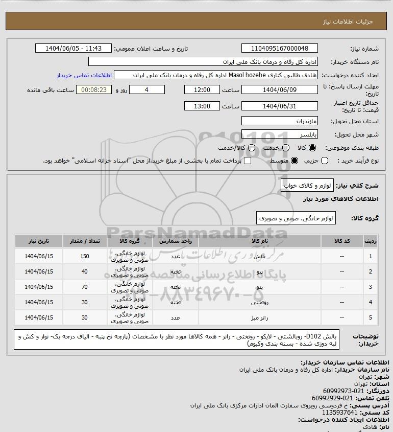 شرح کلی نیاز: لوازم و کالای خواب