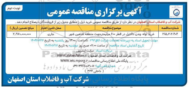 | 404 - 2 - 215/2 | خرید لوله چدن داکتیل در قطر 600 میلیمتر جهت منطقه شاهین شهر | جاری | 2.970.000.000 |