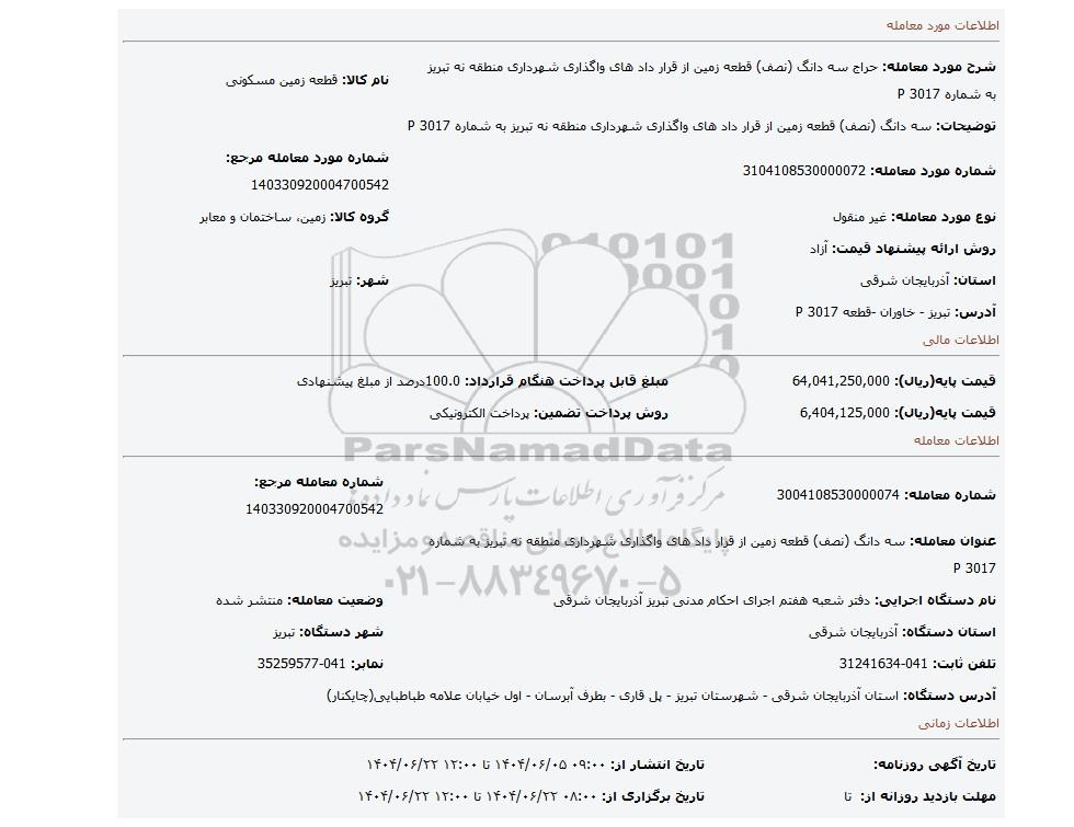 | شرح مورد معامله: حراج سه دانگ (نصف) قطعه زمین از قرار داد های واگذاری شهرداری منطقه نه تبریز به شماره 3017 P | نام کالا: قطعه زمین مسکونی | |
