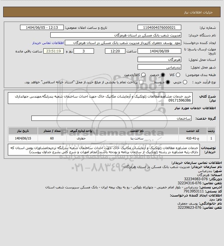 شرح کلی نیاز: خرید خدمات مشاوره مطالعات ژئوتکنیک و آزمایشات مکانیک خاک جهت احداث ساختمان شعبه بندرلنگه.مهندس جهانداری 09171596386