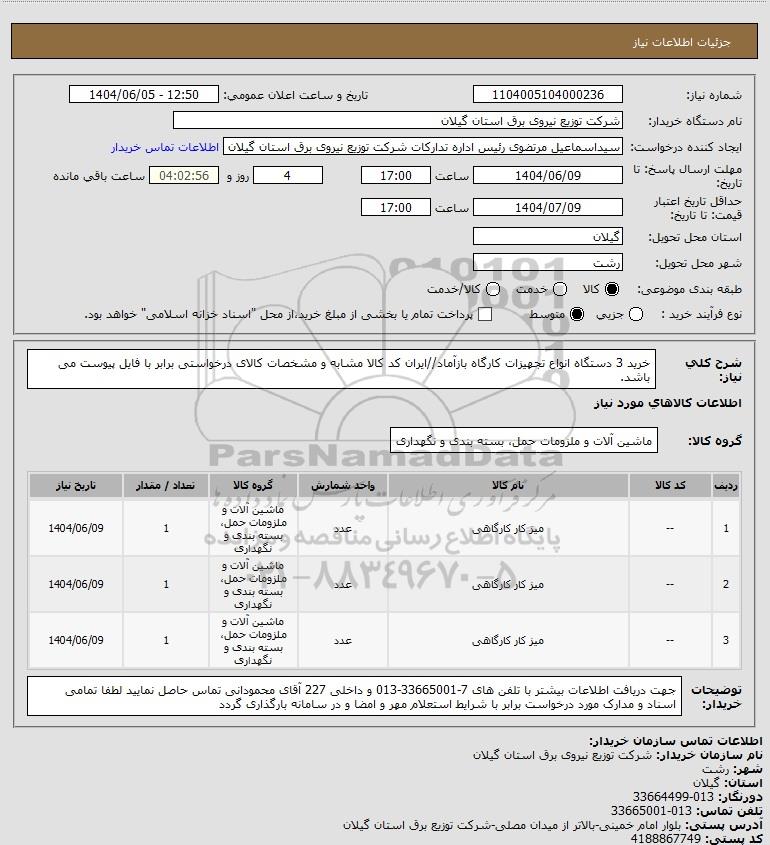 شرح کلی نیاز: خرید 3 دستگاه انواع تجهیزات کارگاه بازآماد//ایران کد کالا مشابه و مشخصات کالای درخواستی برابر با فایل پیوست می باشد.