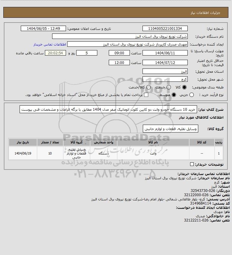 استعلام بها و موضوع استعلام استعلام خرید 10 دستگاه خودرو وانت دو کابین کلوت اتوماتیک صفر مدل 1404 مطابق با برگه الزامات و مشخصات فنی پیوست به اطلاع کلیه شرکتها و افراد متخصص واجد شرایط میرساند، آگهی گذار در نظر دارد از طریق استعلام بها، نسبت به انتخاب و دریافت پیشنهادات اقدام نماید. این استعلام با کد آگهی ثبت شده در سامانه خبرگزاری پارس نماد : 9465014 منتشر شده است. مشخصات استعلام : تاریخ شروع استعلام: 1404/06/05 آخرین مهلت ارسال پیشنهاد قیمت : 1404/06/11 و محل اجرای پروژه : استان البرز میباشد. استعلام قیمت مورد درخواست : استعلام خرید 10 دستگاه خودرو وانت دو کابین کلوت اتوماتیک صفر مدل 1404 مطابق با برگه الزامات و مشخصات فنی پیوست با دستهبندیهای تخصصی و گروه های مرتبط : انواع خودروی سبک, استعلام اطلاع رسانی میگردد.