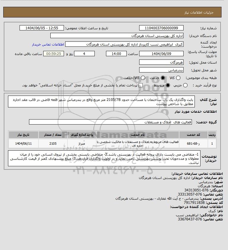 شرح کلی نیاز: بابت واگذاری یک باب ساختمان با مساحت حدود 2105/78 متر مربع واقع در بندرعباس شهر قلعه قاضی در قالب عقد اجاره مطابق با شاخص پیوست
