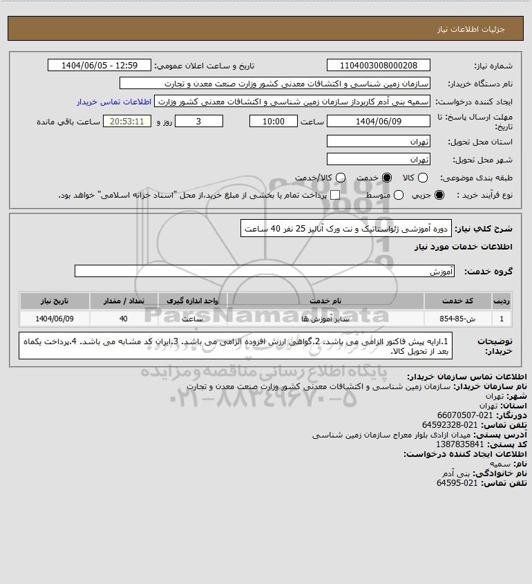 شرح کلی نیاز: دوره آموزشی ژئواستاتیک و نت ورک آنالیز 25 نفر 40 ساعت