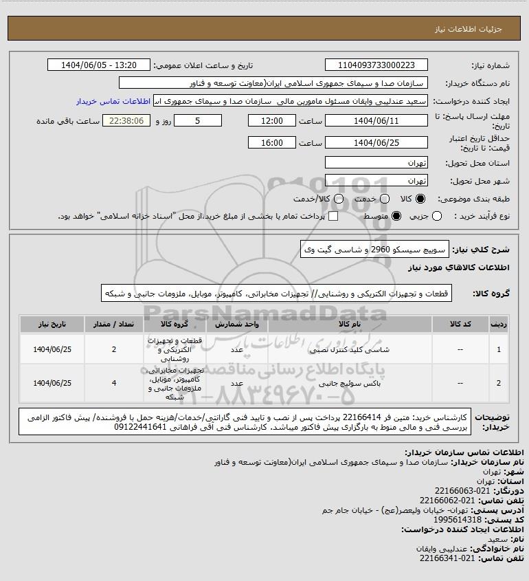 | 1 | -- | شاسی کلید کنترل نصبی | عدد | قطعات و تجهیزات الکتریکی و روشنایی | 2 | 1404/06/25 |