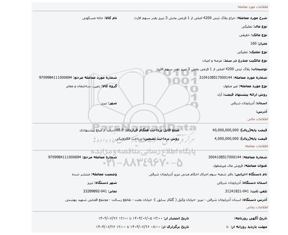 مزایده پلاک ثبتی 4200 اصلی از 1 فرعی بخش 3 تبریز بقدر سهم الارث, مزایده، پلاک ثبتی 4200 اصلی از 1 فرعی بخش 3 تبریز بقدر سهم الارث