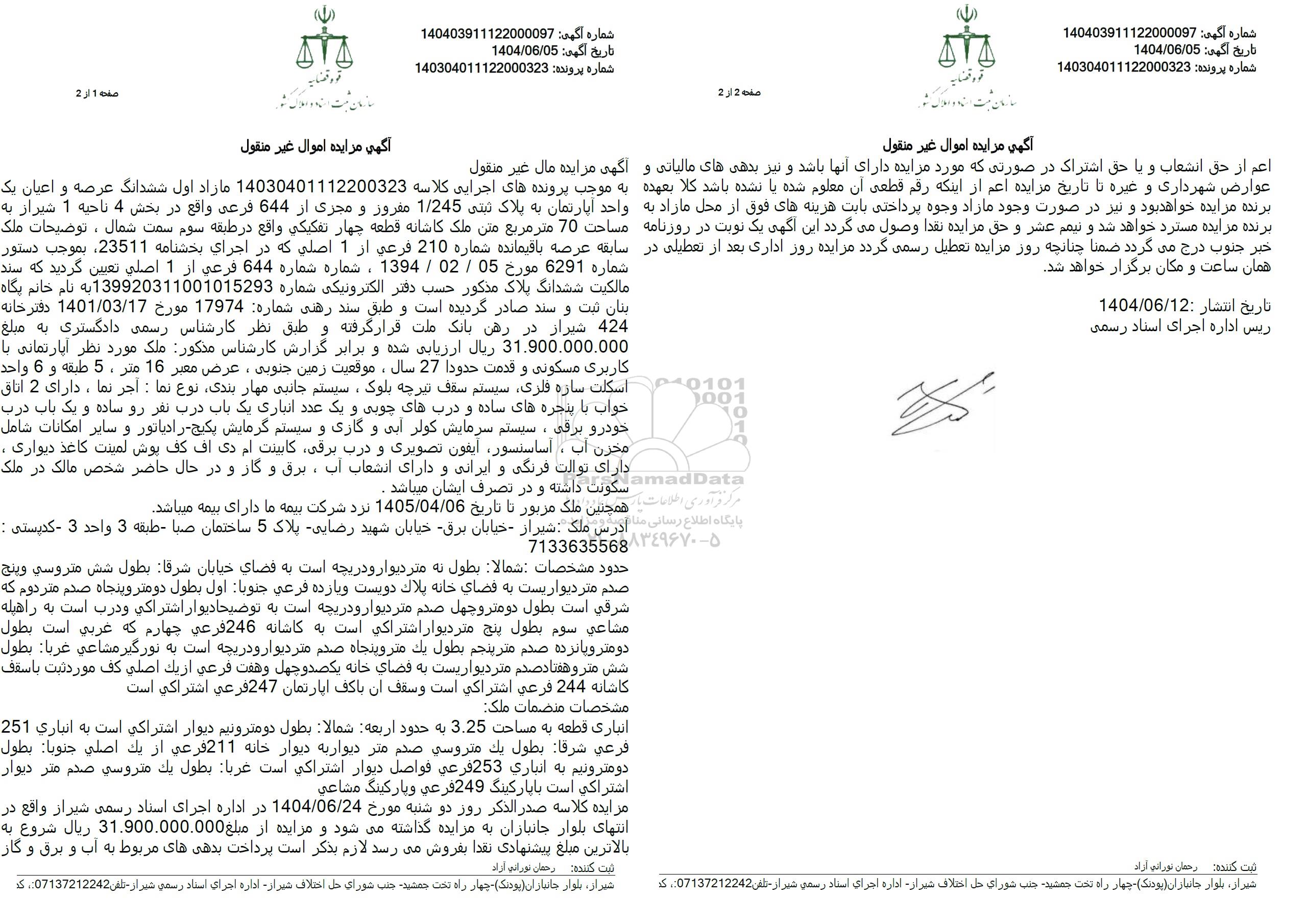 مزایده فروش یک قطعه آپارتمان مسکونی به مساحت 70 مترمربع با پلاک ثبتی 1/245 مفروز و مجزی از 644 فرعی