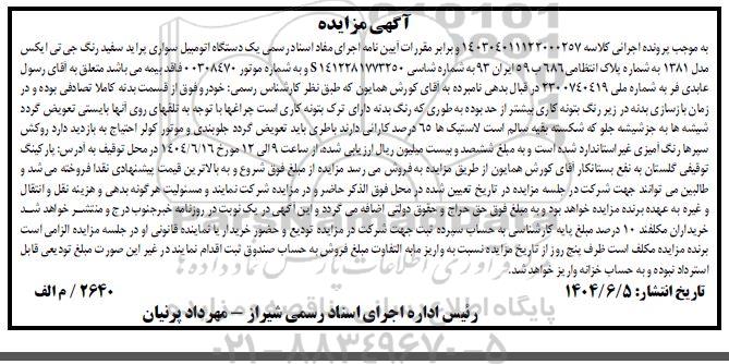 مزایده فروش یکدستگاه اتومبیل سواری پراید سفید رنگ جی تی ایکس مدل 1381 به مبلغ ششصد و بیست میلیون ریال