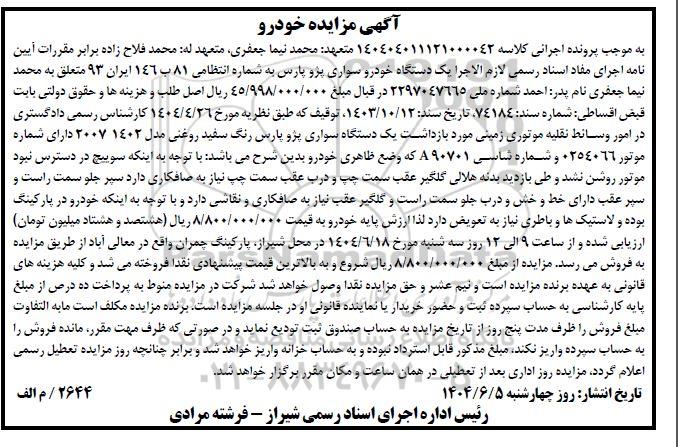 مزایده فروش یک دستگاه خودروی سواری پژو پارس رنگ سفید روغنی مدل 2007 1402 به مبلغ 8.800.000.000 ریال