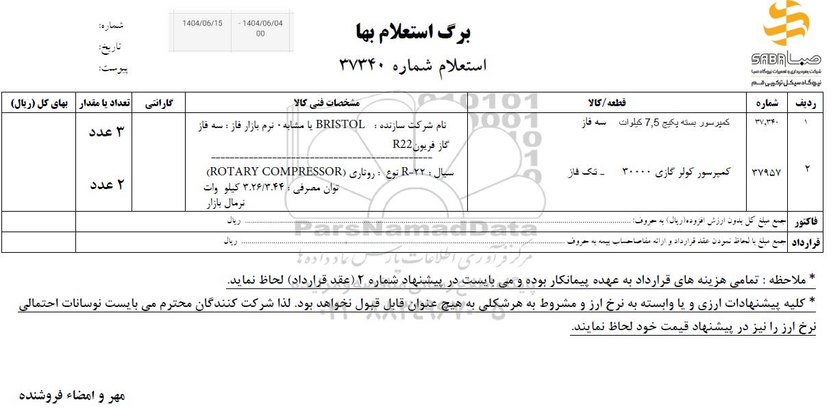 استعلام بها و موضوع استعلام استعلام کمپرسور بسته پکیج و... به اطلاع کلیه شرکتها و افراد متخصص واجد شرایط میرساند، آگهی گذار در نظر دارد از طریق استعلام بها، نسبت به انتخاب و دریافت پیشنهادات اقدام نماید. این استعلام با کد آگهی ثبت شده در سامانه خبرگزاری پارس نماد : 9466323 منتشر شده است. مشخصات استعلام : تاریخ شروع استعلام: 1404/06/05 آخرین مهلت ارسال پیشنهاد قیمت : 1404/06/15 و محل اجرای پروژه : استان قم میباشد. استعلام قیمت مورد درخواست : استعلام کمپرسور بسته پکیج و... با دستهبندیهای تخصصی و گروه های مرتبط : تاسیسات ساختمانی, صنایع حرارتی و برودتی, کمپرسورهای هوا, لوازم خانگی, نیروگاه, تجهیزات برق و الکترونیک, استعلام اطلاع رسانی میگردد. شرایط شرکت در استعلام آنلاین : ابتدا ثبت نام در سامانه استعلام پارس نماد و تکمیل مدارک موردنیاز و بارگذاری در سامانه رعایت تمامی ضوابط و الزامات مندرج در اسناد استعلام است.