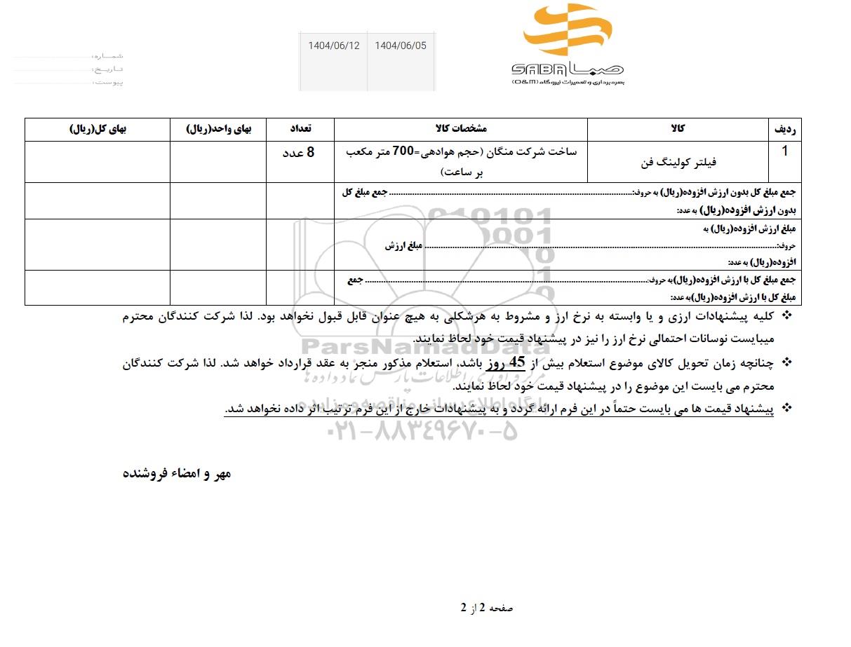 استعلام بها و موضوع استعلام استعلام فیلتر کولینگ فن به اطلاع کلیه شرکتها و افراد متخصص واجد شرایط میرساند، آگهی گذار در نظر دارد از طریق استعلام بها، نسبت به انتخاب و دریافت پیشنهادات اقدام نماید. این استعلام با کد آگهی ثبت شده در سامانه خبرگزاری پارس نماد : 9466328 منتشر شده است. مشخصات استعلام : تاریخ شروع استعلام: 1404/06/04 آخرین مهلت ارسال پیشنهاد قیمت : 1404/06/11 و محل اجرای پروژه : استان سایر میباشد. استعلام قیمت مورد درخواست : استعلام فیلتر کولینگ فن با دستهبندیهای تخصصی و گروه های مرتبط : انواع فیلتر های تصفیه, تاسیسات ساختمانی, صنایع حرارتی و برودتی, سیستم تهویه و هواکشی صنعتی, نیروگاه, تجهیزات برق و الکترونیک, استعلام اطلاع رسانی میگردد. شرایط شرکت در استعلام آنلاین : ابتدا ثبت نام در سامانه استعلام پارس نماد و تکمیل مدارک موردنیاز و بارگذاری در سامانه رعایت تمامی ضوابط و الزامات مندرج در اسناد استعلام است.