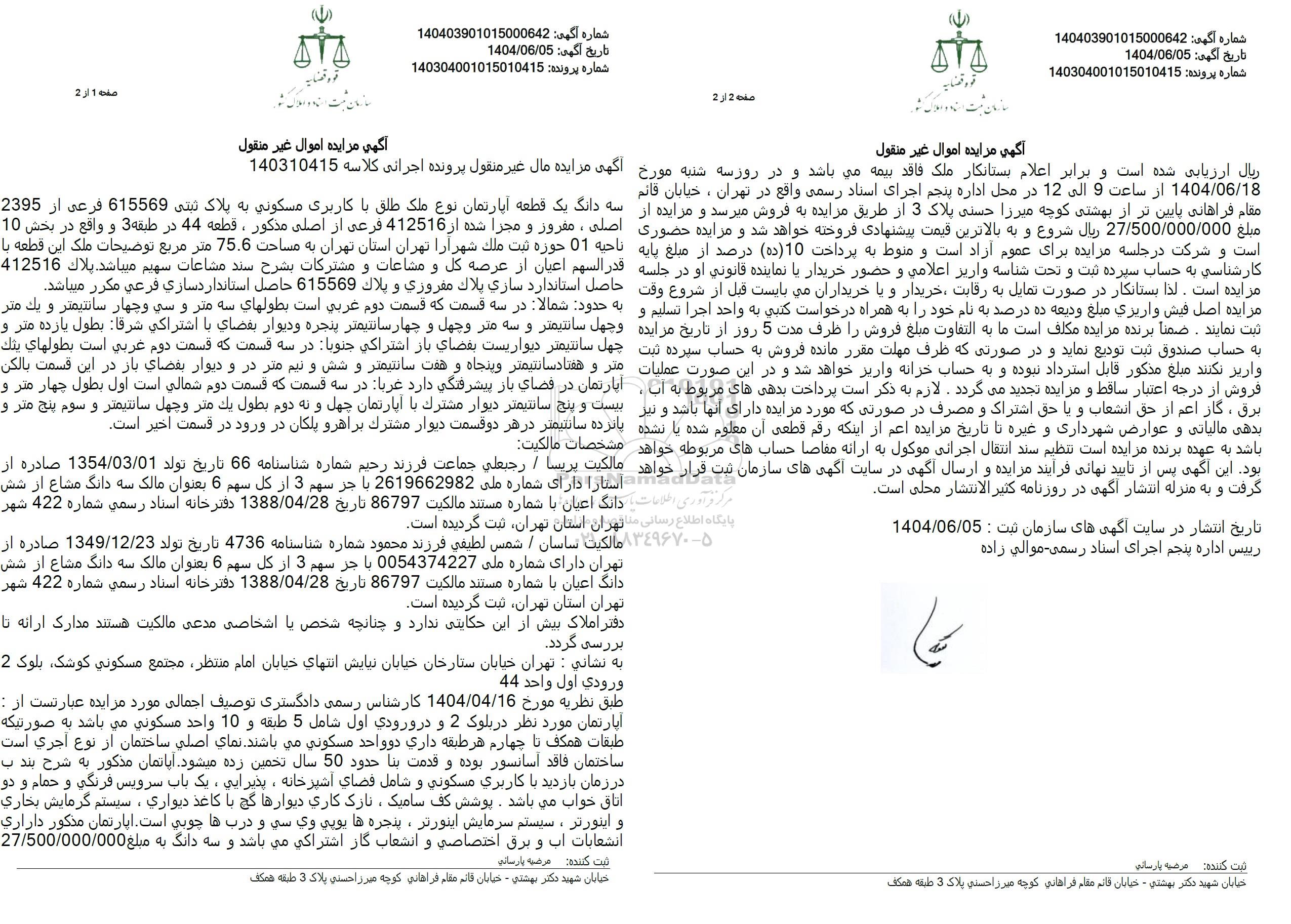 مزایده سه دانگ یک قطعه آپارتمان با کاربری مسکونی به پلاک ثبتی 615569 فرعی از 2395