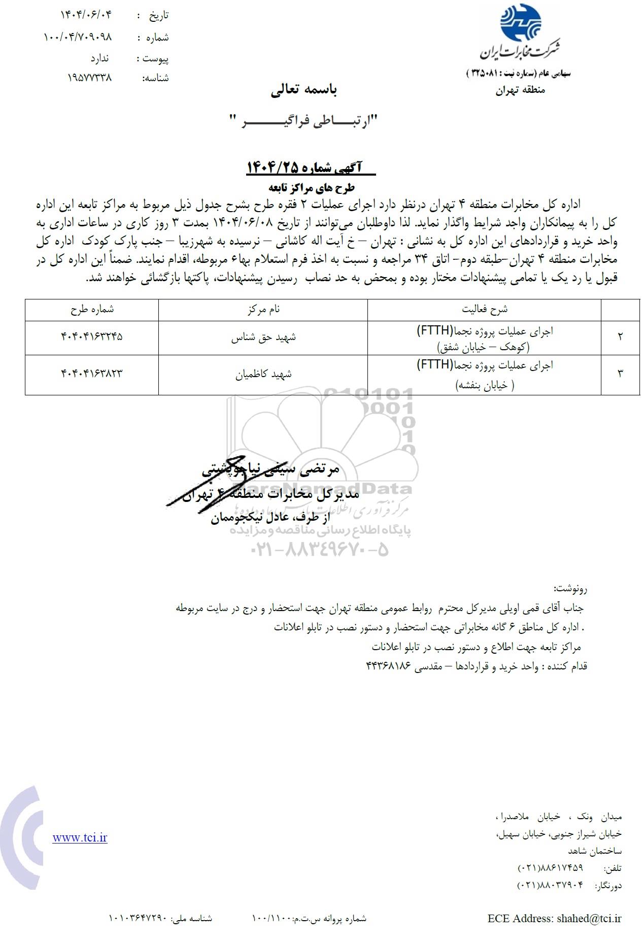 اداره کل مخابرات منطقه 4 تهران در نظر دارد اجرای عملیات 2 فقره طرح بشرح جدول ذیل مربوط به مراکز تابعه این اداره کل را به پیمانکاران واجد شرایط واگذار نماید لذا داوطلبان می توانند از تاریخ 1404.06.08 بمدت 3 روز کاری در ساعات اداری به واحد خرید و قراردادهای این اداره کل به نشانی : تهران - خ آیت اله کاشانی - نرسیده به شهر زیبا - جنب پارک کودک اداره کل مخابرات منطقه 4 تهران طبقه دوم اتاق 34 مراجعه و نسبت به اخذ فرم استعلام بهاء مربوطه اقدام نمایند. ضمناً این اداره کل در قبول یا رد یک یا تمامی پیشنهادات مختار بوده و بمحض به حد نصاب رسیدن پیشنهادات پاکتها بازگشایی خواهند شد.