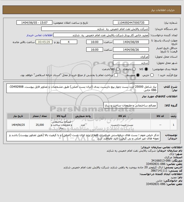 | 1 | -- | بست تثبیت داربست | عدد | مصالح ساختمانی و ملزومات ساخت و ساز | 25,000 | 1404/06/25 |