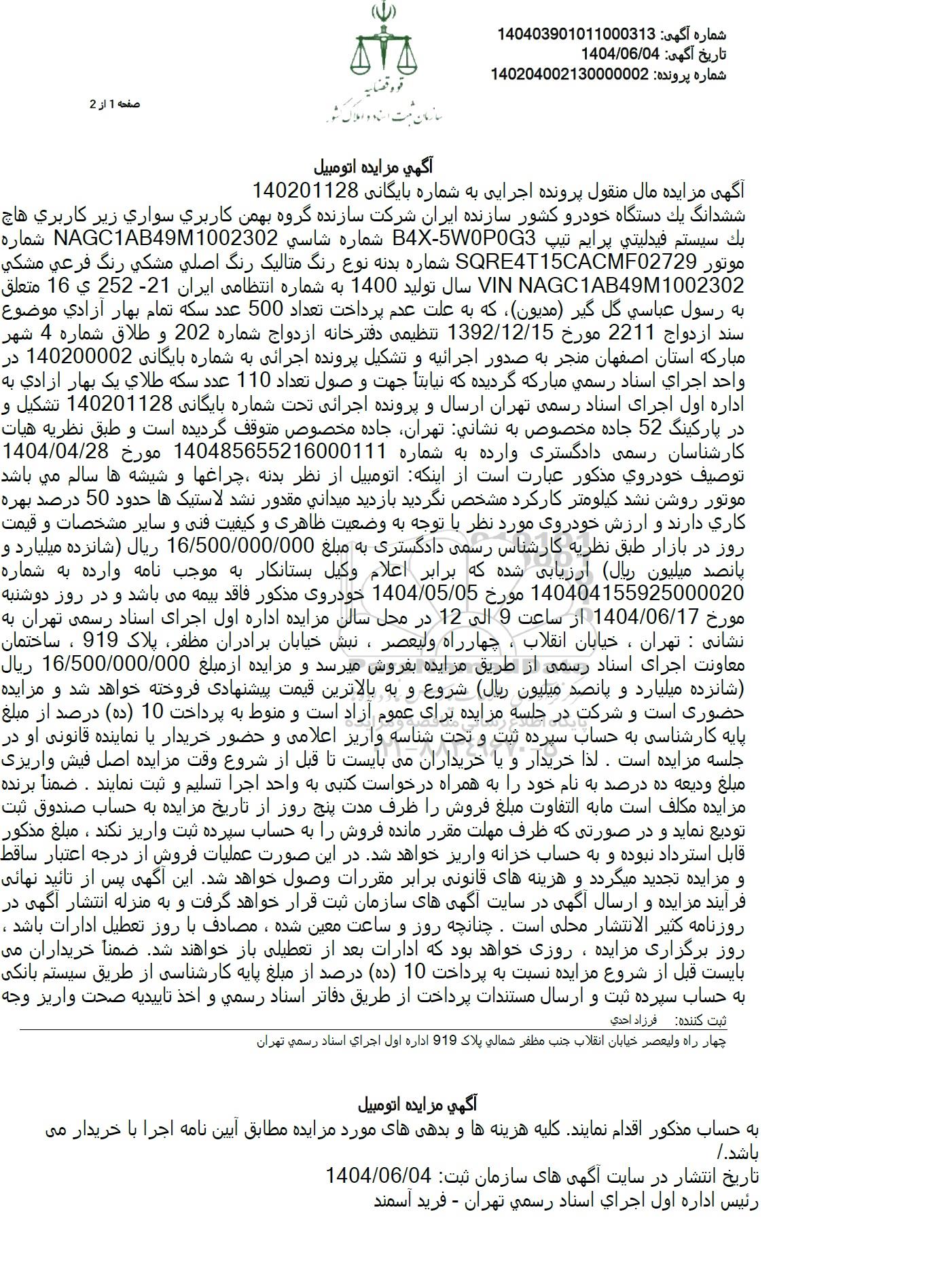 موضوع مزایده : ششدانگ یک دستگاه خودرو کشور سازنده ایران شرکت سازنده گروه بهمن کاربری سواری زیر کاربری هاچ بک به رنگ مشکی سال تولید 1400 به مبلغ 16.500.000.000 ریال