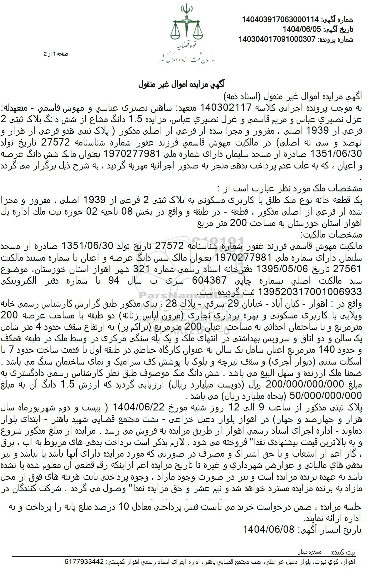 مزایده فروش ششدانگ پلاک ثبتی 2 فرعی از 1939 اصلی , مزایده فروش ششدانگ پلاک ثبتی 2 فرعی از 1939 اصلی
