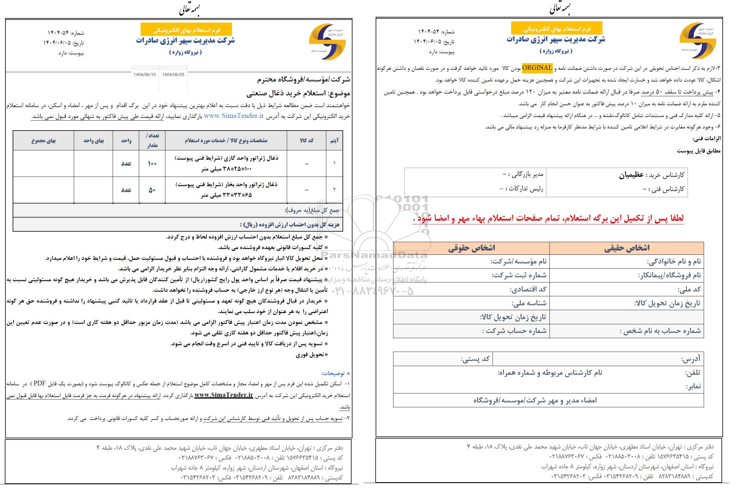 نحوه دریافت اسناد و ارسال پیشنهاد: متقاضیان می‌توانند با ثبت نام در سامانه مناقصات و مزایدات ایران (پارس نماد) نسبت به مشاهده اسناد استعلام، دریافت اطلاعات تکمیلی، و ثبت پیشنهاد قیمت خود اقدام نمایند. در صورت نیاز به دریافت راهنمایی یا پشتیبانی در خصوص استعلام و مناقصه و فراخوان مناقصه عمومی، مناقصه محدود، مناقصه بین‌ المللی، مناقصه دولتی، مناقصه خصوصی، مناقصه آنلاین فروش تجهیزات، مناقصه مشاوره‌ای مناقصه پتروشیمی و انرژی مناقصه صنایع و تجهیزات برق و مخابرات و نفت و گاز ... لطفاً با سایت خبری مناقصه و مزایده پارس‌نماد داده‌ها به شماره 88349670 تماس حاصل فرمایید.