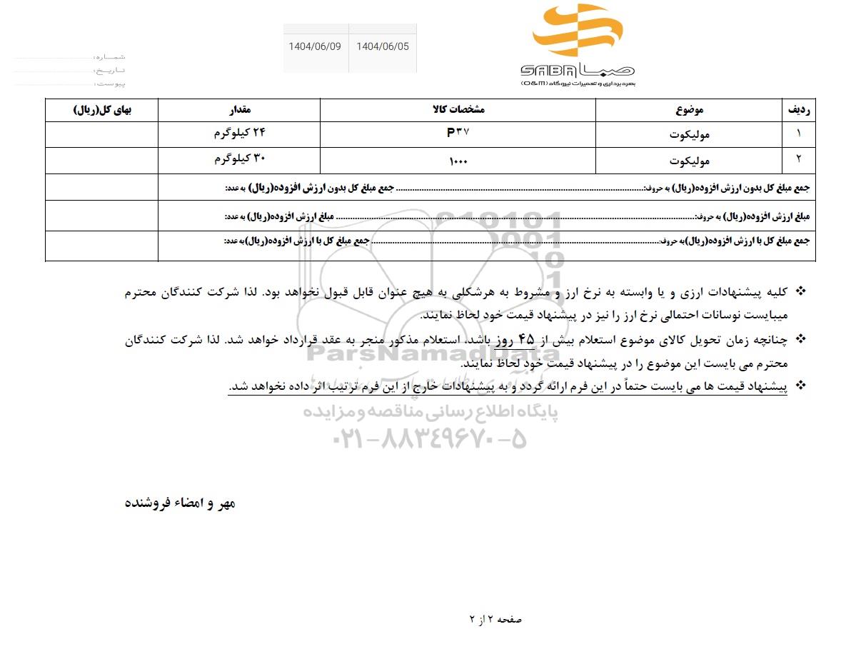 استعلام بها و موضوع استعلام استعلام مولیکوت به اطلاع کلیه شرکت‌ها و افراد متخصص واجد شرایط می‌رساند، آگهی گذار در نظر دارد از طریق استعلام بها، نسبت به انتخاب و دریافت پیشنهادات اقدام نماید. این استعلام با کد آگهی ثبت شده در سامانه خبرگزاری پارس نماد : 9466497 منتشر شده است. مشخصات استعلام : تاریخ شروع استعلام: 1404/06/05 آخرین مهلت ارسال پیشنهاد قیمت : 1404/06/09 و محل اجرای پروژه : استان سایر میباشد. استعلام قیمت مورد درخواست : استعلام مولیکوت با دسته‌بندی‌های تخصصی و گروه های مرتبط : انواع روغن صنعتی, فرآورده های نفتی, مواد شیمیایی, مواد اولیه کارخانجات, استعلام اطلاع رسانی میگردد. شرایط شرکت در استعلام آنلاین : ابتدا ثبت نام در سامانه استعلام پارس نماد و تکمیل مدارک موردنیاز و بارگذاری در سامانه رعایت تمامی ضوابط و الزامات مندرج در اسناد استعلام است.