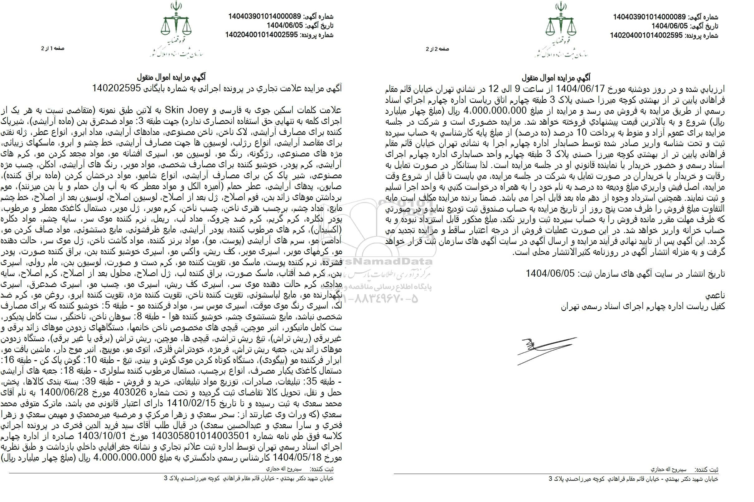 مزایده فروش علامت تجاری (علامت کلمات اسکین جوی به فارسی و SKIN LOEY به لاتین)