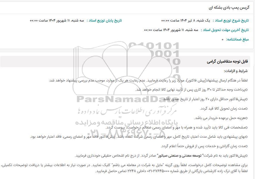 15 استعلام تقاضای 0430141/ پمپ / 9685892 1404/07/20 new not special not payed خوزستان