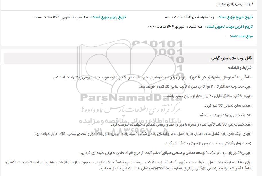 نحوه دریافت اسناد و ارسال پیشنهاد: متقاضیان می‌توانند با ثبت نام در سامانه مناقصات و مزایدات ایران (پارس نماد) نسبت به مشاهده اسناد استعلام، دریافت اطلاعات تکمیلی، و ثبت پیشنهاد قیمت خود اقدام نمایند. در صورت نیاز به دریافت راهنمایی یا پشتیبانی در خصوص استعلام و مناقصه و فراخوان مناقصه عمومی، مناقصه محدود، مناقصه بین‌ المللی، مناقصه دولتی، مناقصه خصوصی، مناقصه آنلاین فروش تجهیزات، مناقصه مشاوره‌ای مناقصه پتروشیمی و انرژی مناقصه صنایع و تجهیزات برق و مخابرات و نفت و گاز ... لطفاً با سایت خبری مناقصه و مزایده پارس‌نماد داده‌ها به شماره 88349670 تماس حاصل فرمایید.