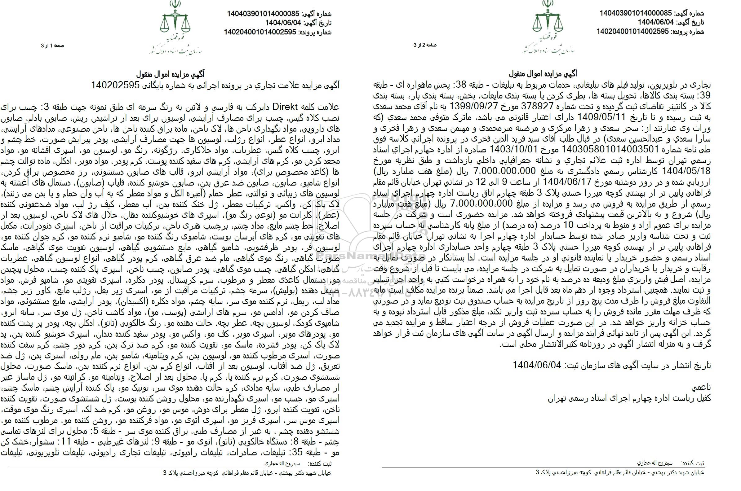 تاریخ مزایده روز دوشنبه مورخ 1404.06.17 از ساعت 9 الی 12 در نشانی تهران- خیابان قائم مقام فراهانی پایین تر از بهشتی کوچه میرزا حسنی پلاک 3