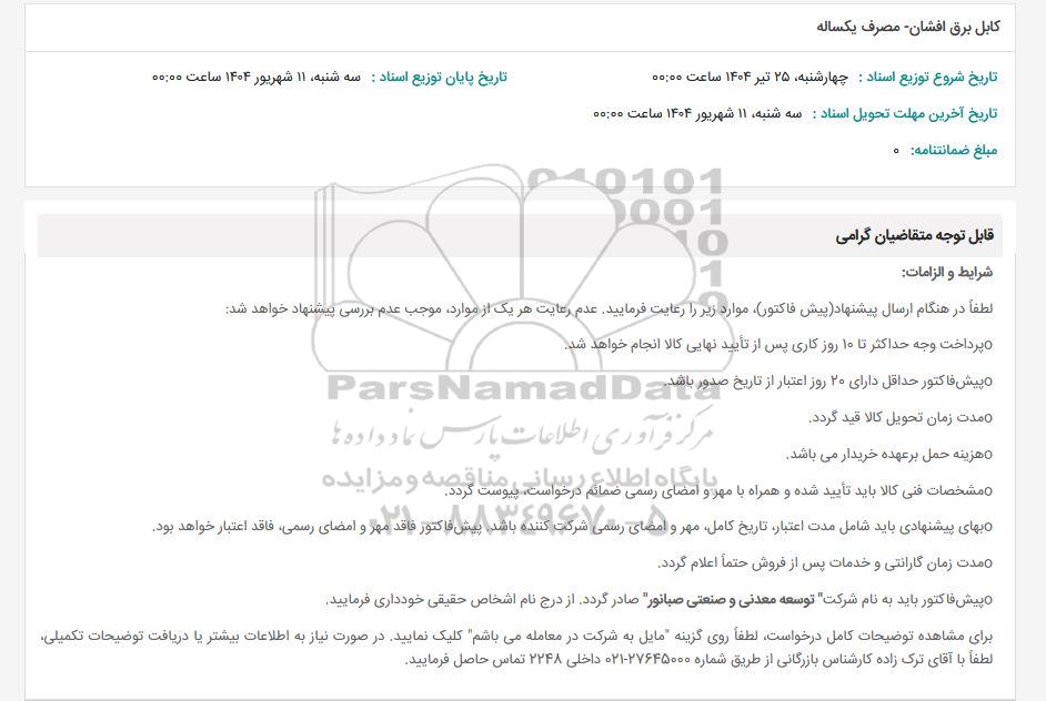 استعلام کابل برق افشان مصرف یکساله, استعلام کابل برق افشان مصرف یکساله