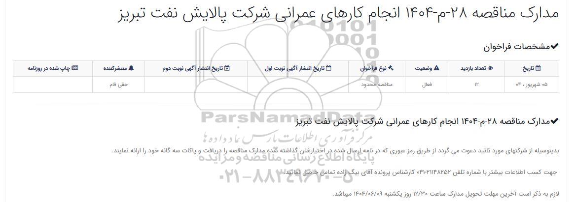 مدارک مناقصه 28-م- 1404 انجام کارهای عمرانی شرکت پالایش نفت تبریز