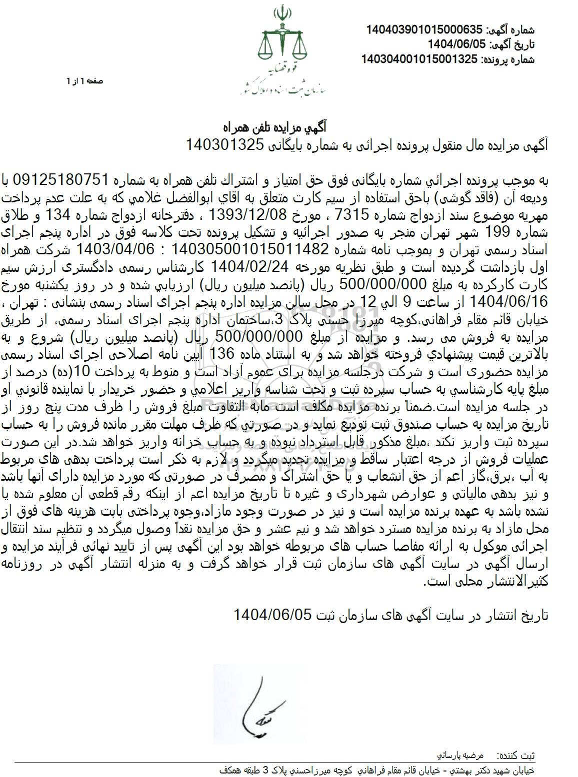 موضوع مزایده : حق امتیاز و اشتراک تلفن همراه به شماره 09125180751 به ارزش 500.000.000 ریال