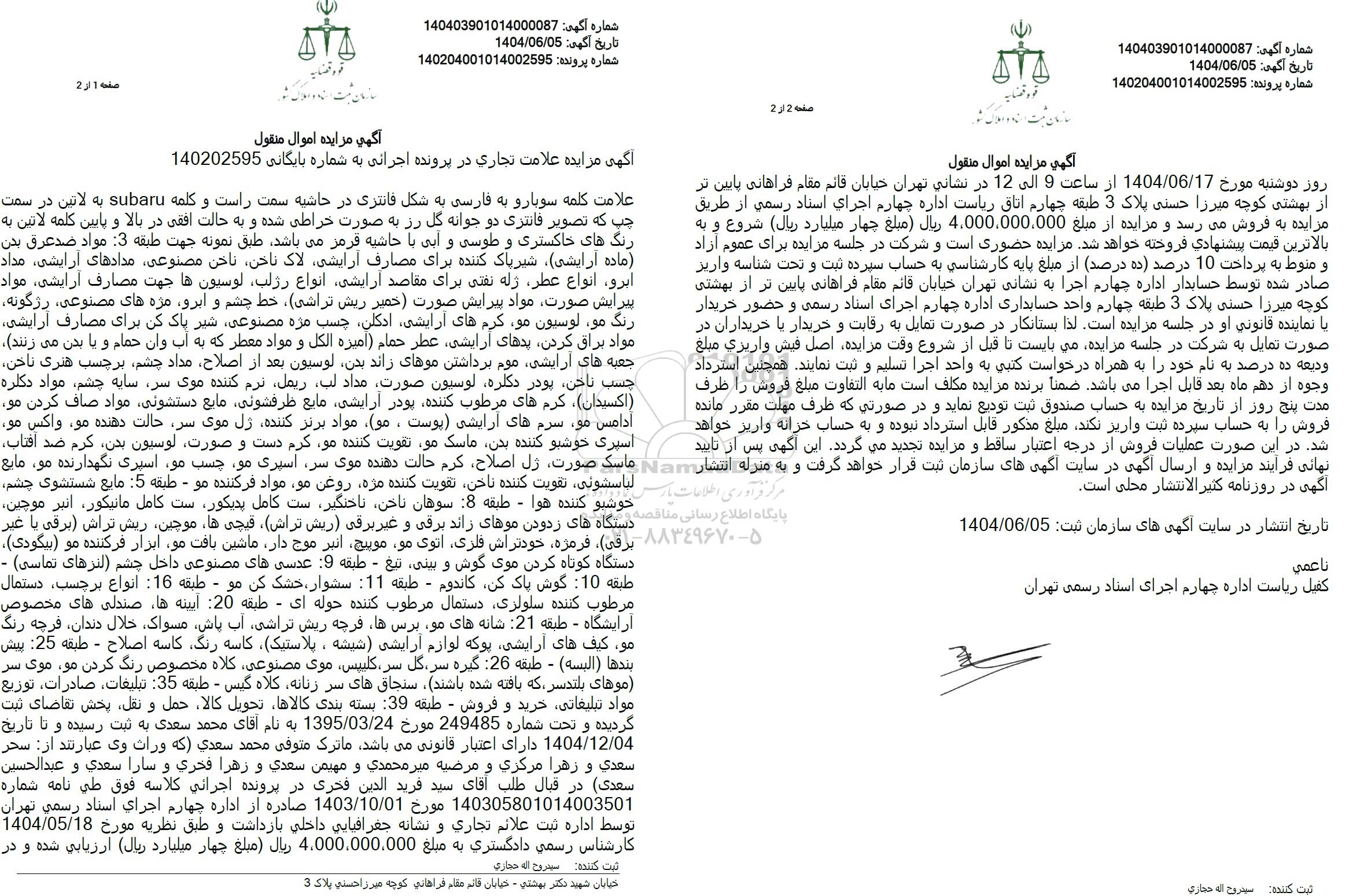 مزایده فروش علامت تجاری (علامت کلمه سوبار و به فارسی به شکل فانتزی در حاشه سمت راست) و...