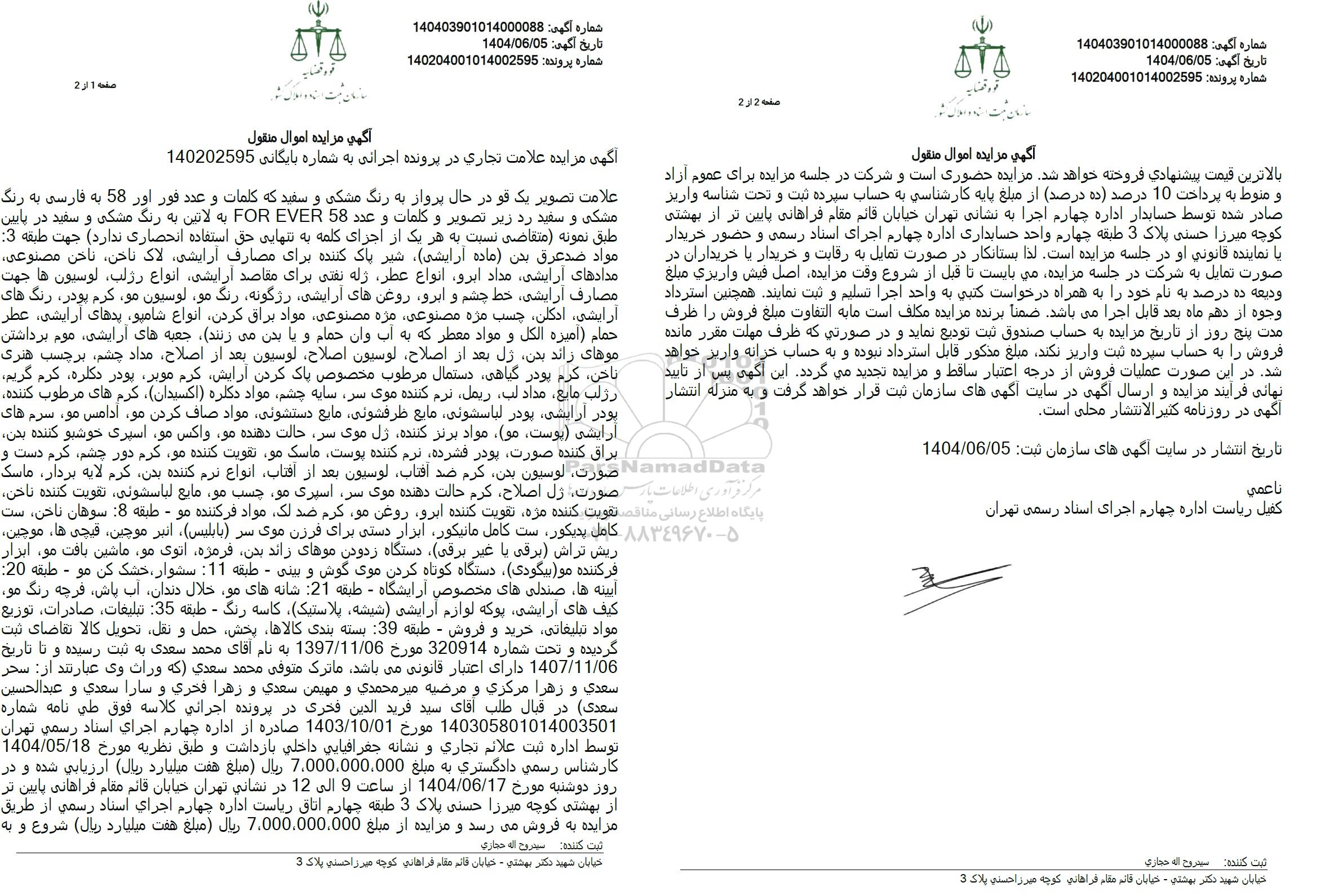مزایده فروش علامت تجاری (علامت تصویر یک قو در حال پرواز به رنگ مشکی و سفید ) و...