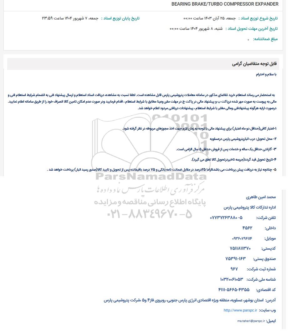 به استحضار می رساند استعلام خرید تقاضای مذکور در سامانه معاملات پتروشیمی پارس قابل مشاهده است. لطفا نسبت به مشاهده دریافت اسناد استعلام و ارسال پیشنهاد فنی به انضمام شرایط استعلام فنی و عالی به پیوست به صورت مهر شده دریاکت ب و پیشنهاد مالی در پاکت ج در مهلت مقرر وعينا مطابق با شرایط استعلام اقدام فرمایید و در صورت عدم امکان تامین کالا انصراف خود را از طریق سامانه اعلام نمایید. در صورت ارایه هرگونه پیشنها دفنی و مالی مغایر با شرایط استعلام پیشنهادات دریافتی مردود اعلام خواهد شد.