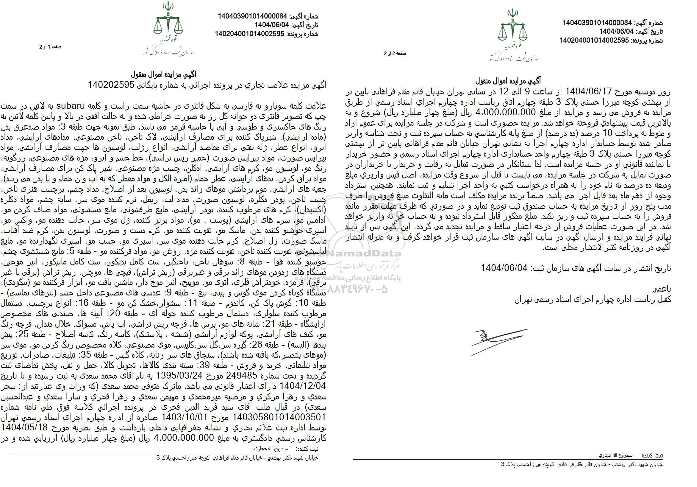 تاریخ مزایده روز دوشنبه مورخ 1404.06.17 از ساعت 9 الی 12 در نشانی تهران- خیابان قائم مقام فراهانی پایین تر از بهشتی کوچه میرزا حسنی پلاک 3