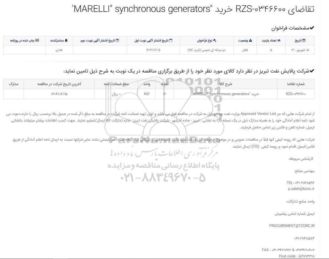 مناقصه P/F "MARELLI " SYNCHRONOUS GENERATORS, مناقصه P/F "MARELLI " SYNCHRONOUS GENERATORS